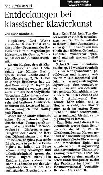 Measured, lucid, serene, and above all, superlatively intelligent, Martin Hughes's piano recital at the Queen Elizabeth Hall yesterday was an artistic triumph, something for his audience to treasure in their hearts and minds. Martin Hughes delivered the solo part of Oiseaux Exotiques with brilliant vividness, hectic and delicate by turns and always lucid; superb playing,echoed in the raucous avian swirlings and drummings of wind and percussion Martin Hughes is an excellent pianist; not only does he have a rich technical ability, a quality he shares with many others, but also a capacity for a very special personal commentary - his interpretation is unique Martin Hughes is a marvellous pianist and he brought much refinement and energy to the work (Beethoven Piano Concerto Nr. 2 Op. 19) . His cadenza in the first movement was superb; it managed to be virtuosic and understated simultaneously and was so well articulated that every note rang out. Le concert a surtout amené le découvert du pianiste Martin Hughes. Il a montré qu'il est un formidable soliste dans la sonate en si mineur de Franz Liszt. Il sait jouer de toutes les difficultés avec sensibilité, intelligence et une concentration que rien n'a pu déranger Une evenément qui a situé le nom du pianiste anglais Martin Hughes parmi ceux des maitres absolus du clavier de notre temps Every pianist who is seriously interested in rendering the spirit of a Beethoven piano work ought to read it. |